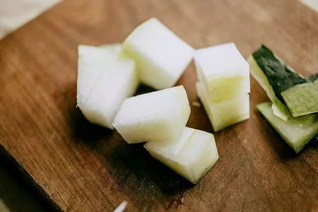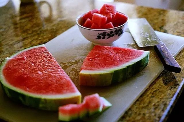 一个“斫”(zhuo4)字,生猛形象,清脆爽朗的瓜裂声,有如探秘桃花源那般兴奋:初极狭——均匀裂缝里的宝石红隐隐若现;豁然开朗——成片的红瓤夺人眼球,早已顾不上那么多,怕是端庄淑雅的林黛玉见了这粉硕多汁的果肉,也会吃得满嘴红渣。