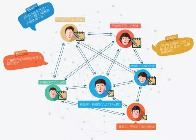 所以有一天,班里同学聚在一起开了个非组织性非营利性非娱乐性的茶话会,隆重而又严肃地提出了一个看上去万瑞靠谱的方案:给每个人都发一本账簿,任何人之间转账都通过大喇叭或微信群等方式@所有人,收到通知后大家都在自己的账簿上记上一笔,这就是目前去中心化的思路。