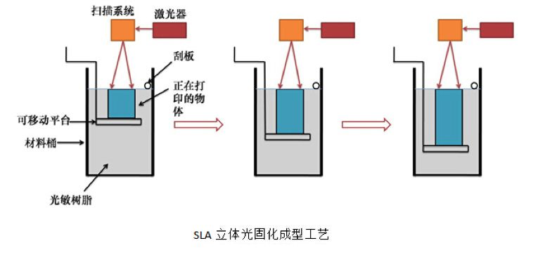 SLA 是"Stereo lithography Appearance"的缩写,即立体光固化成型法。用特定波长与强度的激光聚焦到光固化材料表面,使之由点到线,由线到面顺序凝固,完成一个层面的绘图作业,然后升降台在垂直方向移动一个层片的高度,再固化另一个层面。这样层层叠加构成一个三维实体。