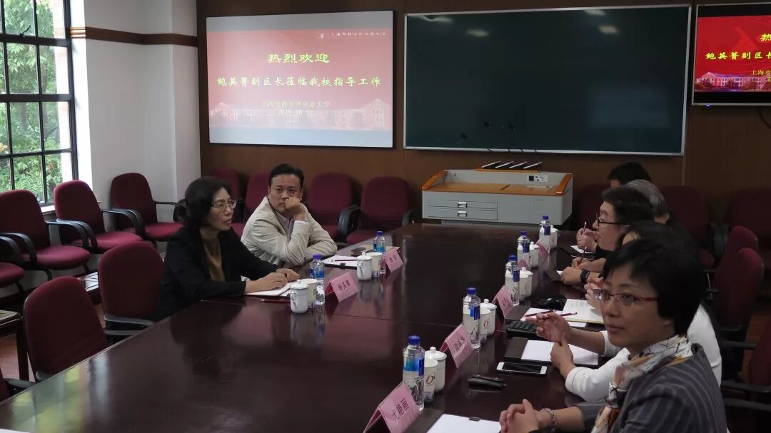 10月12日下午,静安区副区长鲍英菁到我校调研工作,静安区教育局副局长顾炜、成社教科科长陈永华陪同,我校副校长(主持工作)蒋中华、党总支副书记沈燕华、副校长冯雁辉、副校长尤艳丽、校长助理兼校务办公室主任蒋彭等领导班子热情接待了鲍英菁副区长一行。