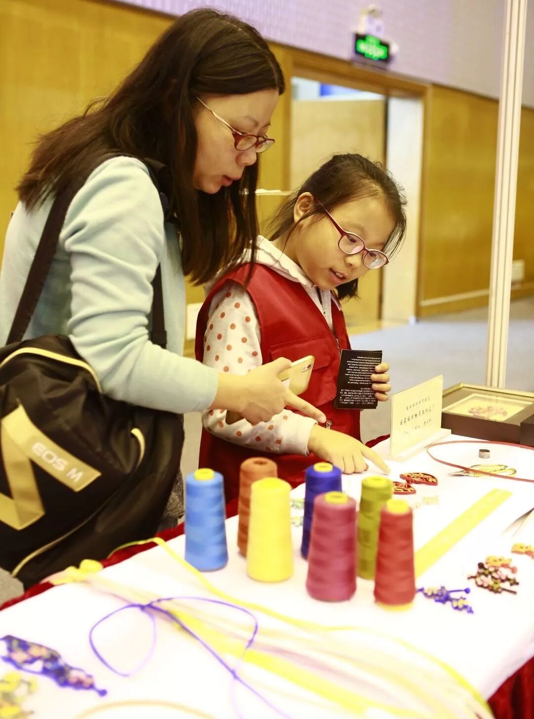 一对母女在展位前欣赏盘扣