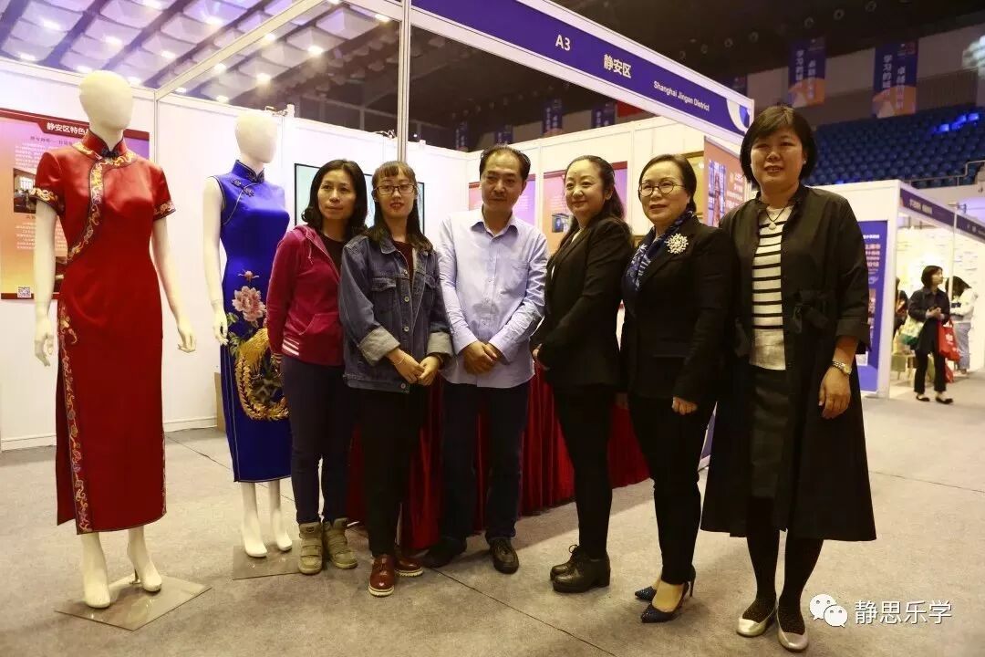 上海市教委终身教育处姚岚、上海市成人教育协会副会长兼秘书长孙莉萍、静安社区学院社教部主任杨玉明与龙凤旗袍非遗传人、公司负责人等一起在静安展台前进行合影。