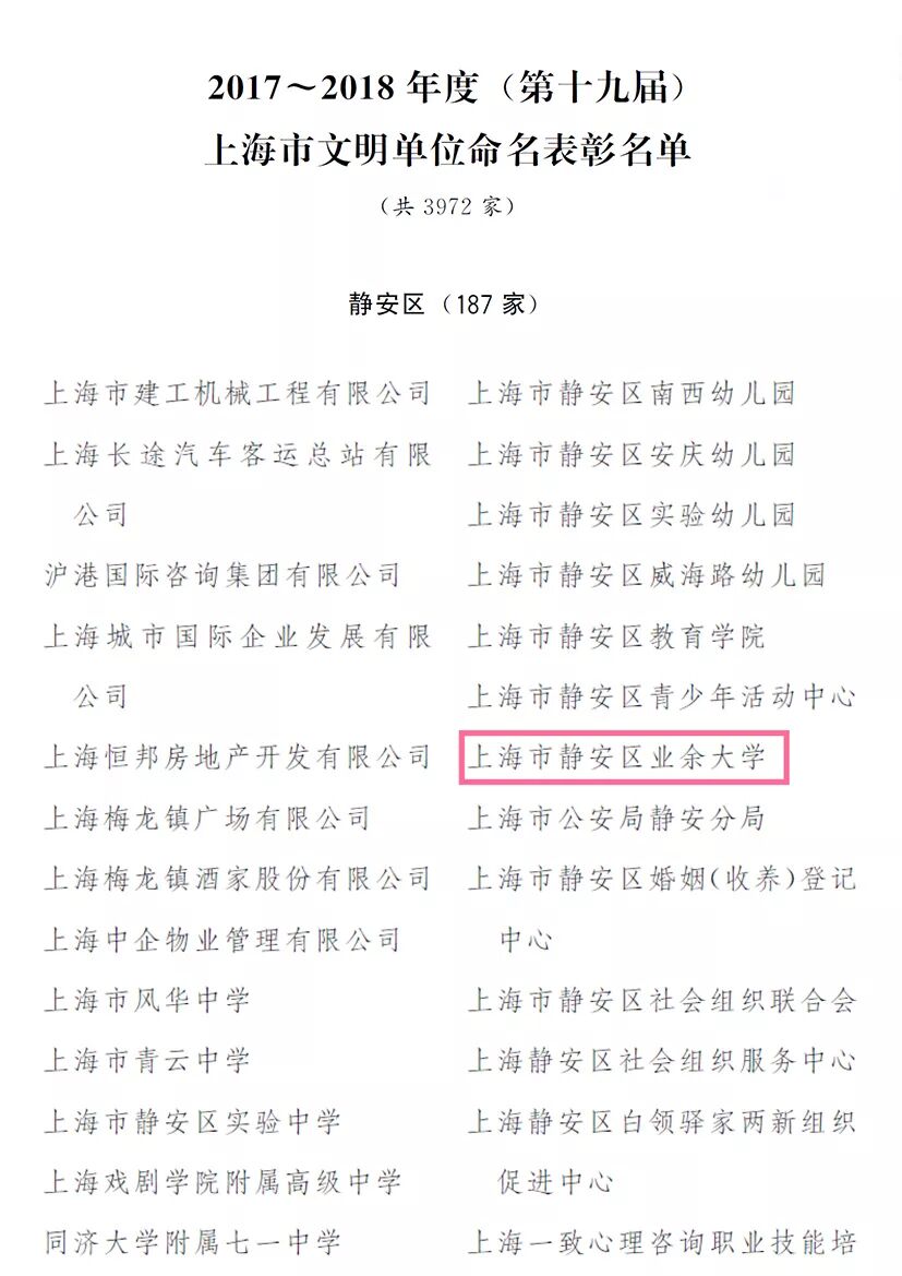 4月10日,市政府公布“2017-2018年度(第十九届)上海市文明单位命名表彰名单”,我校再次荣膺“上海市文明单位”,这是我校连续8次获此殊荣,是全校师生凝心聚力、奋发有为的结果,标志着学校精神文明创建踏上一个新台阶。