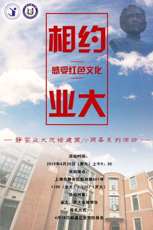 岁月如梭,精神永存。为迎接中华人民共和国成立70周年,丰富学生的校园文化活动,也为了让同学们更好地了解国史国情、校史校情,4月20日上午9:30在胶州路601号面向业大、开大全体学生开展“相约业大 感受红色情怀”活动。此次活动也将作为学校迎接建国70周年系列活动的开场活动。