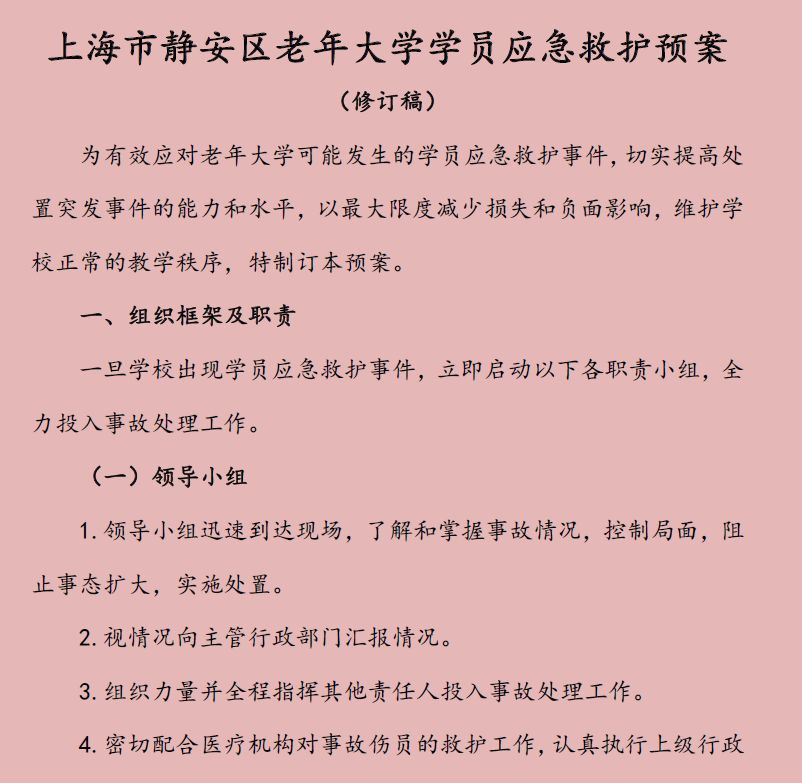 为维护学校正常的教学秩序,给老年学员提供更为贴心的学习支持服务,小组修订《静安区老年大学学员应急救护预案(修订稿)》,加强劳动保护,做到防微杜渐,切实提高了处置相关突发事件的能力和水平,为老年学员的安全防护提供了有力保障