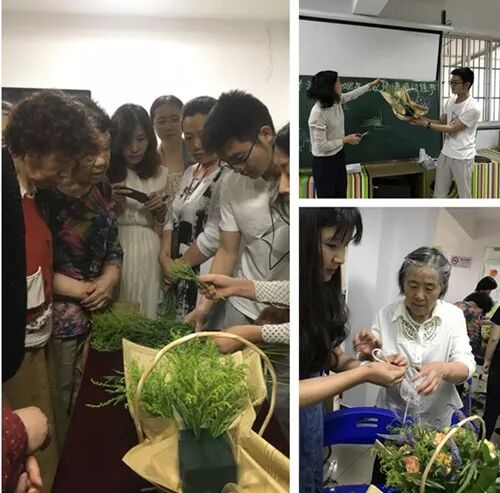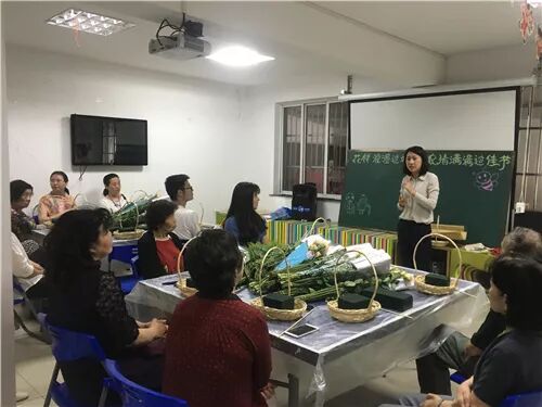 体验艺术插花,浓浓心意融于花间。学校特邀静安区老年大学口碑极佳的高级插花师许建芸指导高荣居民区的党员和学生们从一块花泥开始,将一枝枝花材变为一个个精美的花篮。许建芸运用图解法,介绍了三角插花,水平插花,扇形插花等常见的花型,结合假日公主玫瑰、紫罗兰、黄边康乃馨、蓬莱松等花材的特点,使在场的插花新手们掌握基础知识的同时感到成竹在胸,他们“咔咔咔”修剪多余的枝叶,减掉过长的枝干,在插花过程中互相探讨:“你的蓬莱松还可以再修修。”“康乃馨和假日公主都是黄色的,要明确主次。”……认真构图配色之余,大家还不忘此次活动的重要目的,正如陈新兰所说的:“插花要以花诉情,以情动人。只要想到自己的作品将当作端午节礼物送给社区退休党员和他们脸上将要露出的笑容,我一定要好好做,送出最美的作品和最真诚的爱心。”