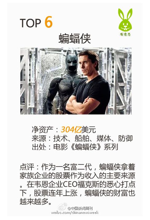 蝙蝠侠拥有净资产304亿美元,排名第6