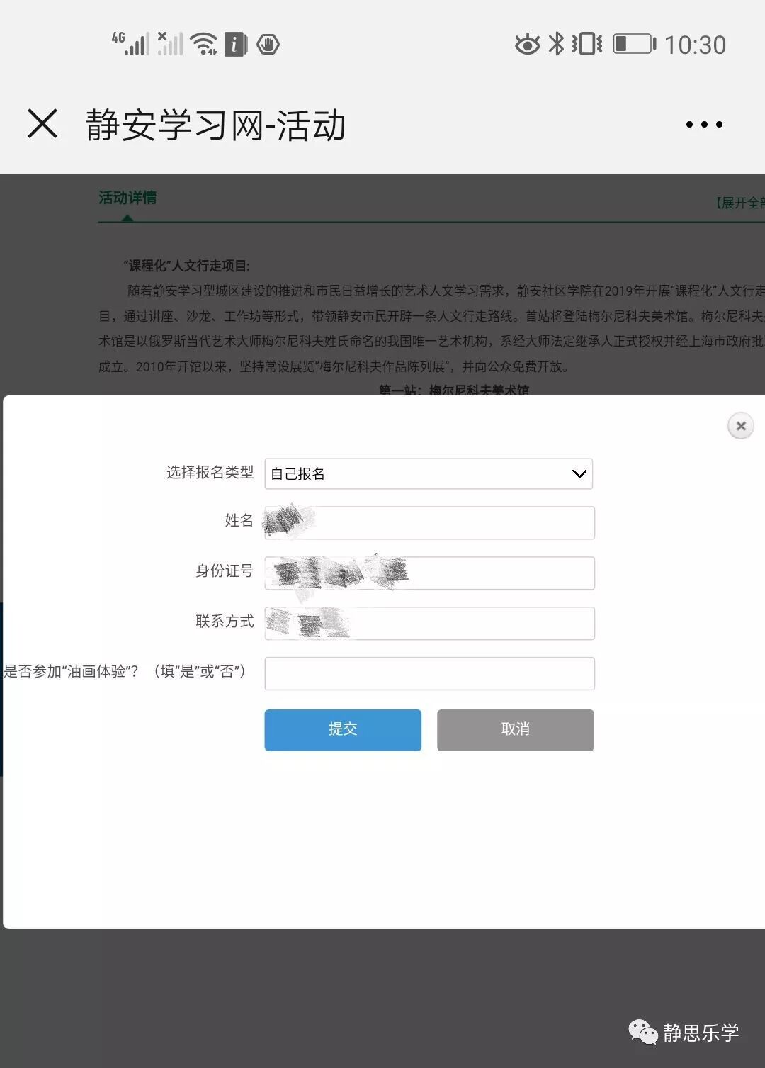 登录后或者您已经绑定了静安学习网账号,会弹出报名信息填写界面。如果您在注册时填写了手机号码与身份证号,选择“自己报名”便可自动完成信息填写,若无则请补充完整。