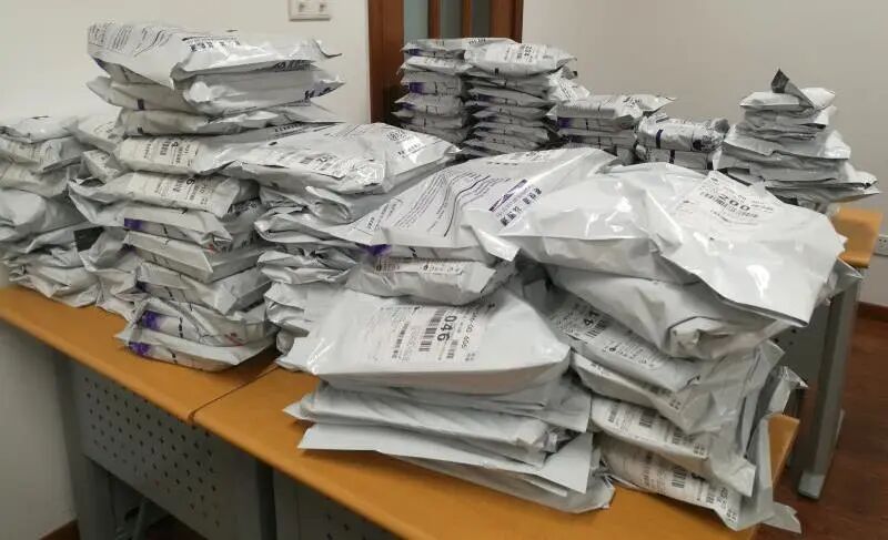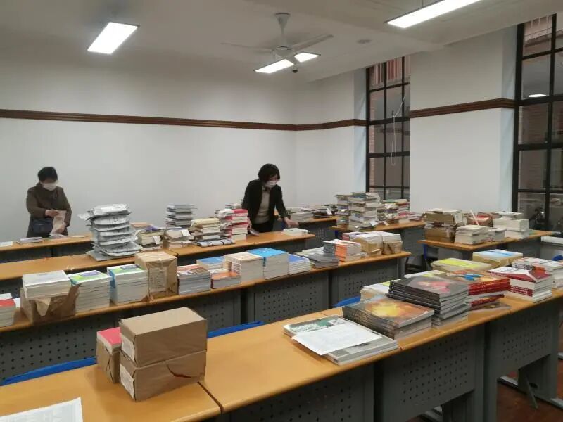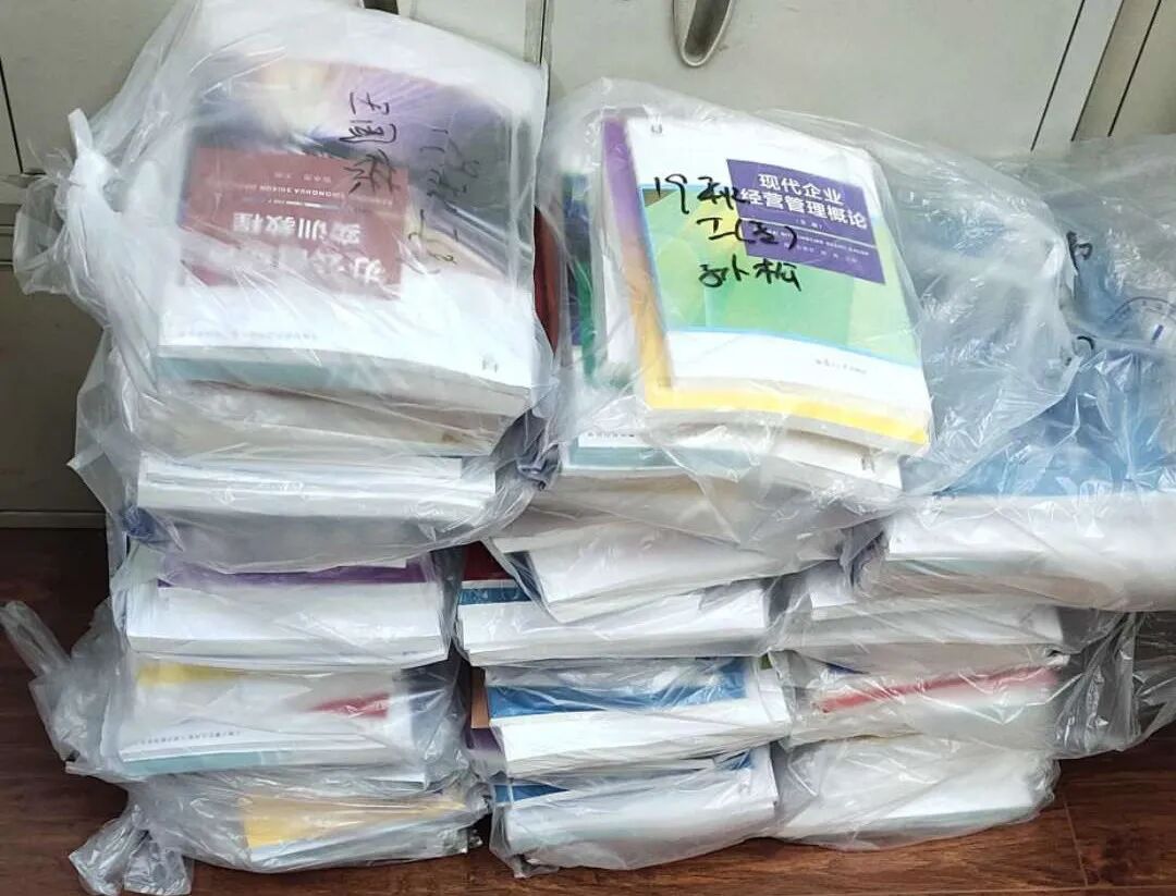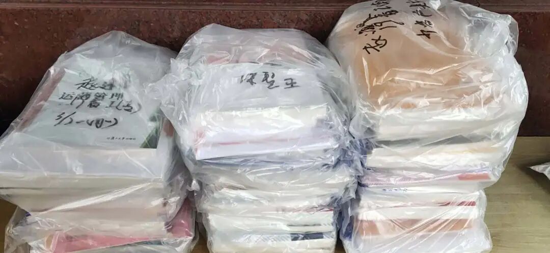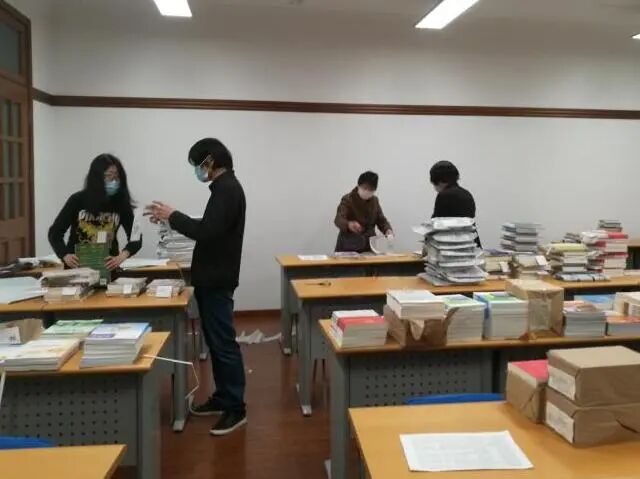 收到班主任们汇总上来的信息,教务科的老师们纷纷行动起来,带好口罩,做好消毒工作,对新教材进行分类、整理、打包、装袋,将快递的教材和自取的教材区分开,共装袋近几百册书籍,17日下午15:00,第一批教材就打包完毕交给快递公司投递……