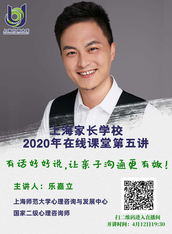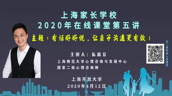 2020年4月12日(周日)晚上7:30分,上海家长学校在线课堂第五讲将邀请上海师范大学心理咨询与发展中心国家二级心理咨询师乐嘉立作客“云开学堂”直播平台,为大家带来主题为《有话好好说,让亲子沟通更有效》的在线讲座,帮助家长和孩子更加有效地沟通,建立更加和谐温暖的亲子关系!