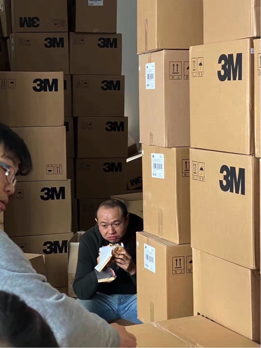 我校18秋网络营销管理(本科)专业的梅羽同学,是上海光贺自动化科技有限公司经理,3M经销商。在疫情蔓延的时刻,接到前线医疗用品告急的消息后,他第一时间回到单位,和同事一起连续工作3天3夜,饿了就简单吃几口面包,喝点水;累了就在仓库里歇口气,回过神了接着干,不眠不休赶进度,成功向武汉发送了20万包口罩。