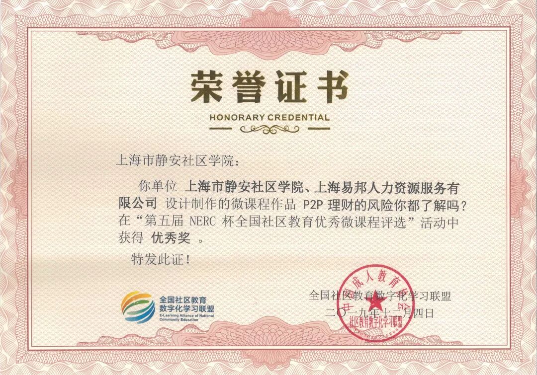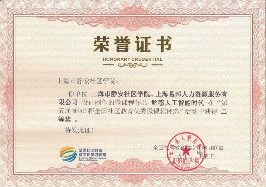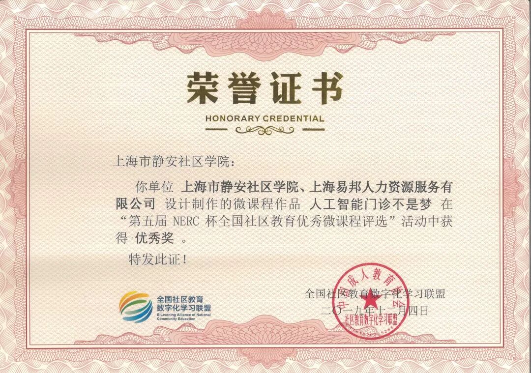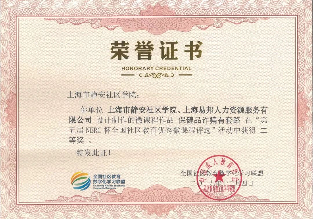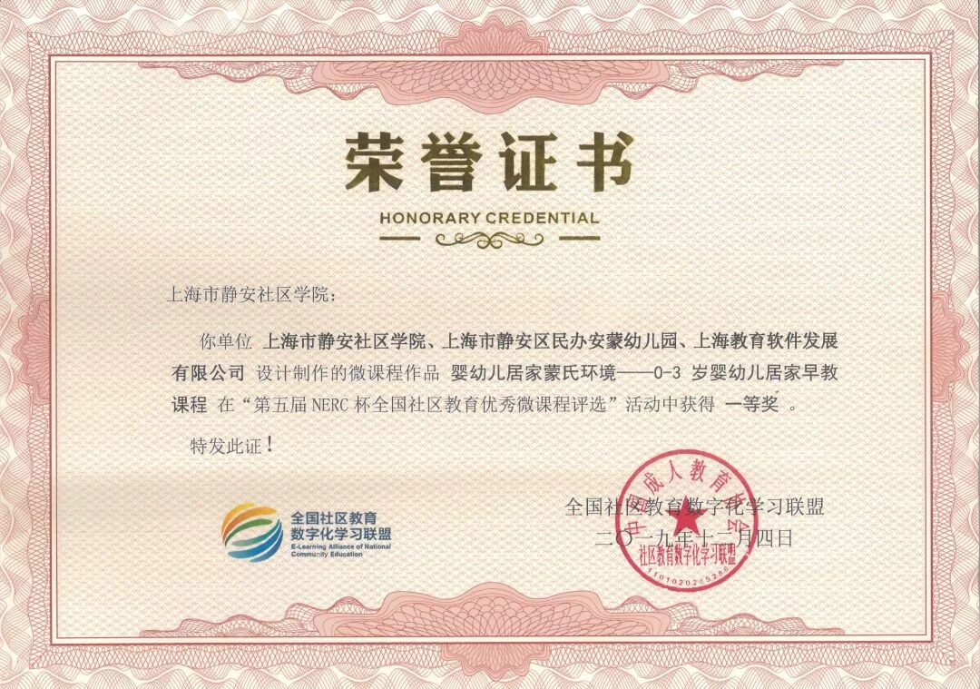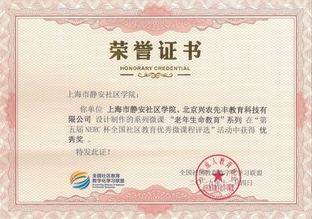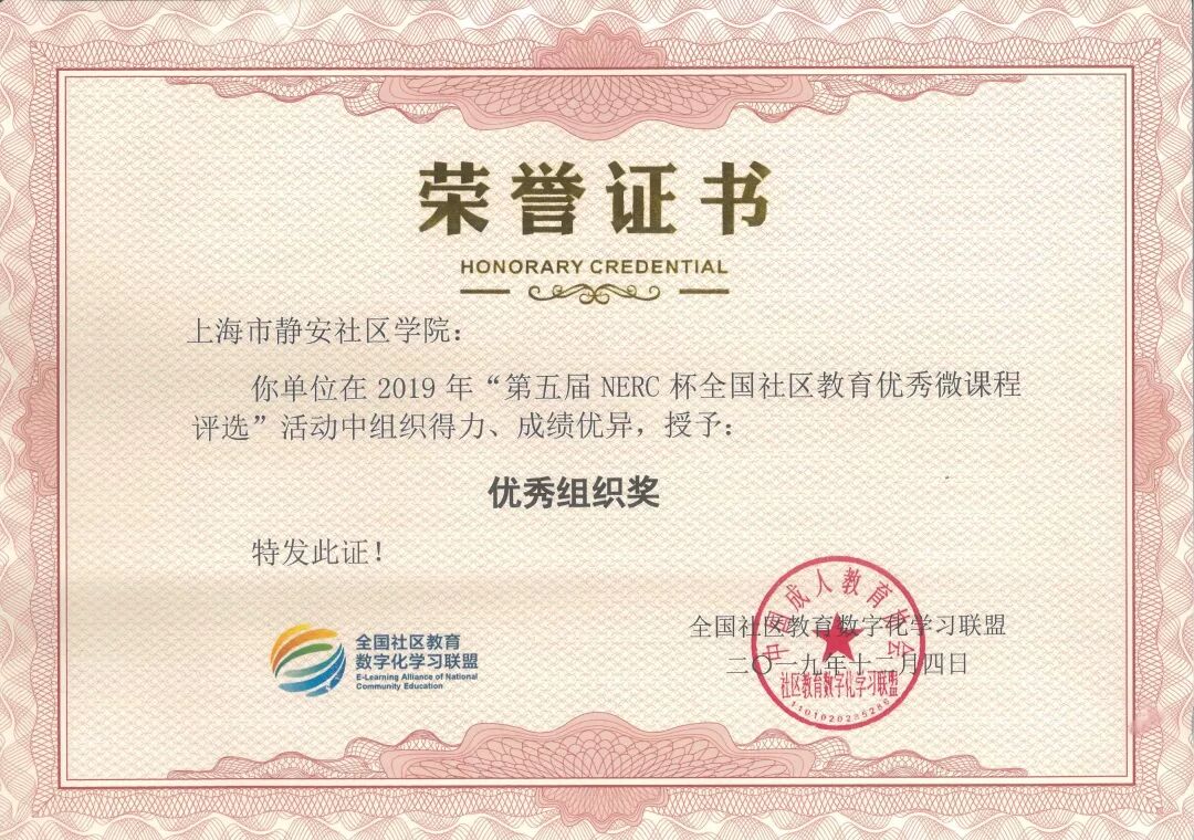 2019年12月19日,国家数字化学习资源中心主办的2019 年国家数字化学习资源中心分中心工作研讨会在武汉召开。静安社区学院在全国社区教育数字化学习联盟与教育部社区教育研究培训中心共同主办的“第五届NERC杯全国社区教育优秀微课程评选活动”中荣获优秀组织奖。