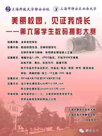 征集要求:每幅作品1-3M,JPEG格式,不低于600万像素,风格不限,黑白,彩色均可,数量不限。电子作品文件命名形式:作品名-姓名-班级-学号-联系电话。例如:美丽校园-张三-13工商-006-电话。