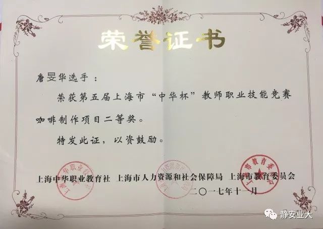 唐旻华上海市第五届中华杯咖啡制作项目二等奖